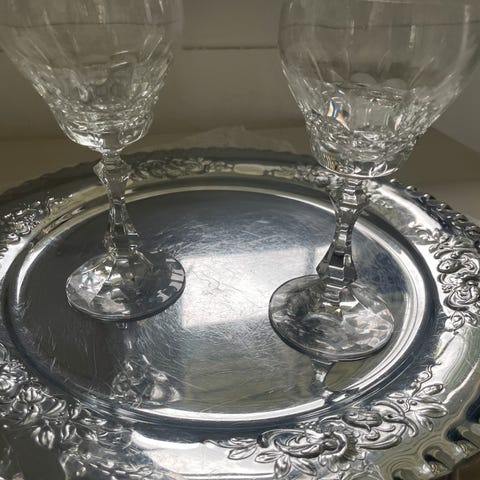 Tallerkenene/fatene er i god forfatning med tanke på alder. De er hele og fine, og har litt bruksmerker, se bilde. Gullkant rundt fatene er noe borte. Det ene fatet har et lite hakk, se bilde.