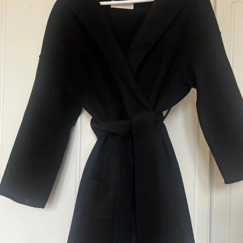 Pen svart kåpe fra Gina i størrelse 38, tilsvarer s-m. Godt brukt, men fortsatt mye bruk igjen.