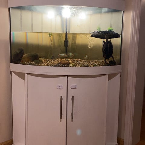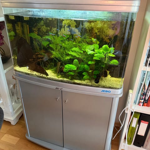 JEBO R-Style R375 KG 160l akvarium med tilhørende skap. Akvariet har innebygd belysning og filter, og skapet gir oppbevaringsplass under akvariet. Farge på skap og akvarium er grå.