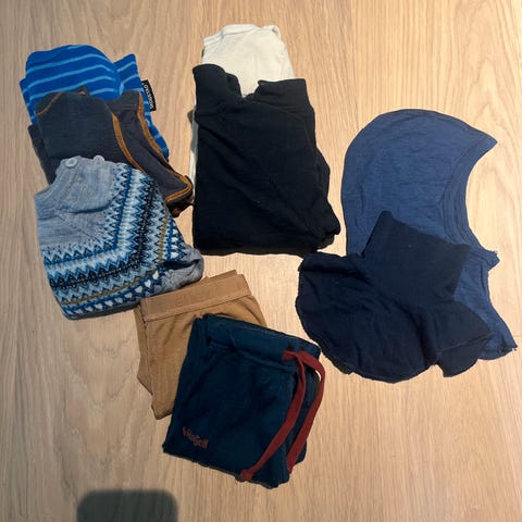 Stor pakke med klær som er pent brukt. Inneholder en ullstrømpebukse fra mp og en ullbukse fra Hummel. Ellers merker som Joha, villervalla, nameit m.m