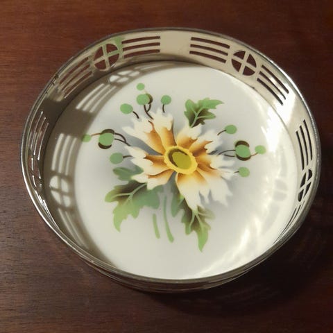 Vakre eldre brikker fra Italia, mest sannsynlig fra 60-tallet. Fin patina og farge, noe bruksslitasje som kan forventes. Det er fire mindre brikker til glass og en større brikke til en beholder.
