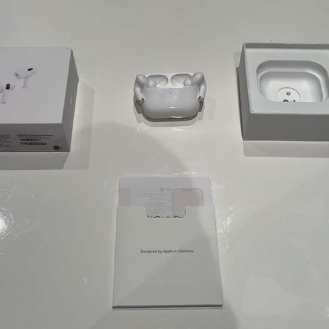 Apple AirPods Pro trådløse hodetelefoner i hvit farge. Inkluderer ladeetui og to individuelle ørepropper. Designet for trådløs tilkobling og bærbar bruk.