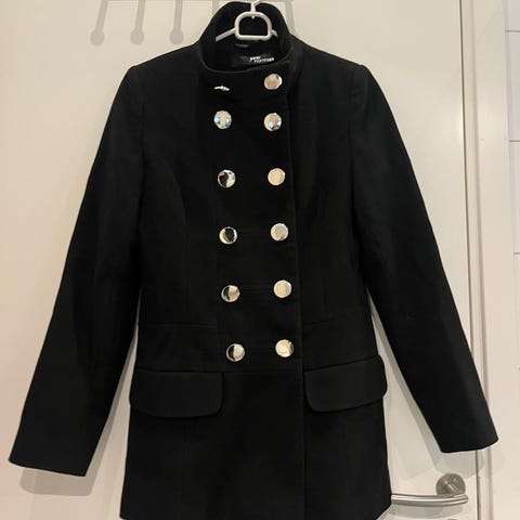 Superfin kåpe med feminint innsvinget snitt og sorte knapper. Fargen er beige/camel. Str 10- tilsvarer str 36/38 eller S. Kjøpt i London for en tid tilbake, men selges da jakken er for liten til meg. Jakken er knapt brukt.