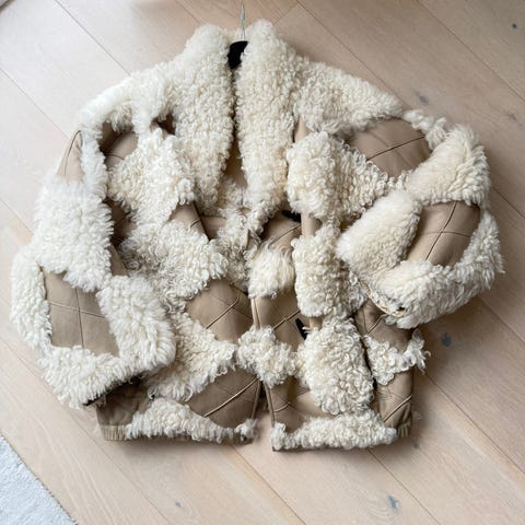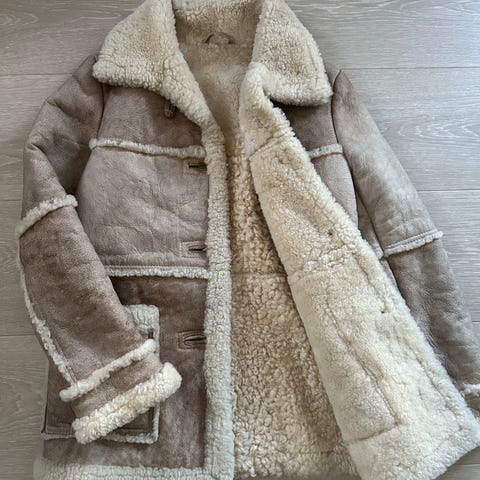 Selger på vegne av min samboer en strøken shearling-jakke fra Eivissa Milano i en beige/naturlig farge og semsket/nubuck ytterside. En meget varm vinterklassiker, selvsagt i 100% ekte skinn/shearling og «Made in Italy».