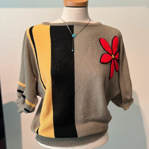 Genser fra Betty Barclay i viskose, bomull og polyamid. Gennombrutt i blått, grått og sølv. Størrelse 44. Ekstra vidde i sidene, 3/4 ermer, brystvidde 110 cm og lengde 67 cm