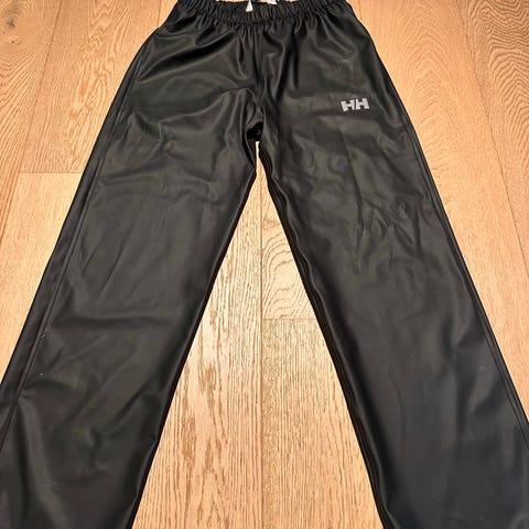 Fin regnbukse i lett materiale med snøring i livet, strikk nederst på bena og trykk-knapp.