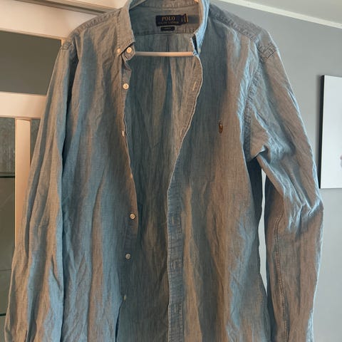 Ralph Lauren Classic Fit skjorte for menn i størrelse L. Skjorten har blå og hvite striper og er laget av bomull. Den har knappelukking foran og brodert Polo-logo på brystet.