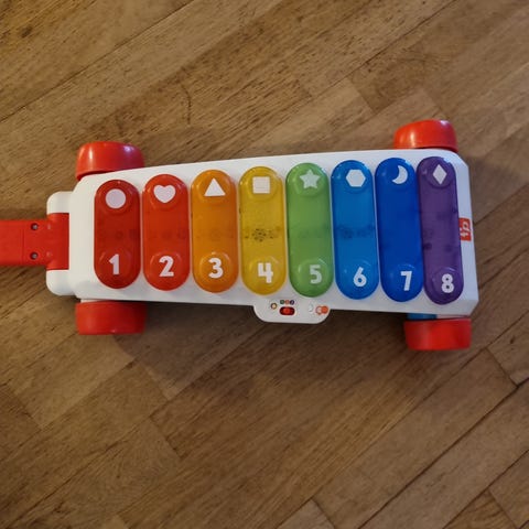Morsom leke til et lite barn. Spiller låter og barnet kan selv spille, Lyser og blinker. Noe bruksmerker,se bilder. Batteri følger ikke med. Selges for 90,- , porto kommer i tillegg, for eksempel post nord 69,-