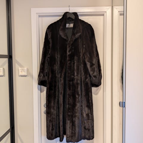 Svart pelskåpe for kvinner i størrelse M. Kåpen har lang lengde og er laget av pelsmateriale, med en løs passform og lange ermer.