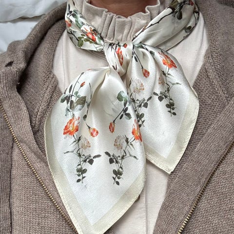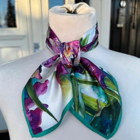 Grønnfarger i mange toner. Passer også veldig fint til bunad og er også flott til herre. Skjerf i Mulberry silke. Veldig fin silke kvalitet da Mulberry silke er den beste silke kvaliteten. 100% silke. Helt som nytt. Veldig enkelt å dandere på ulike måter. Størrelse 53x53cm. Kan gjerne sende som brev med posten til 31.-