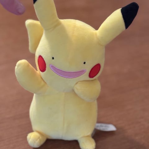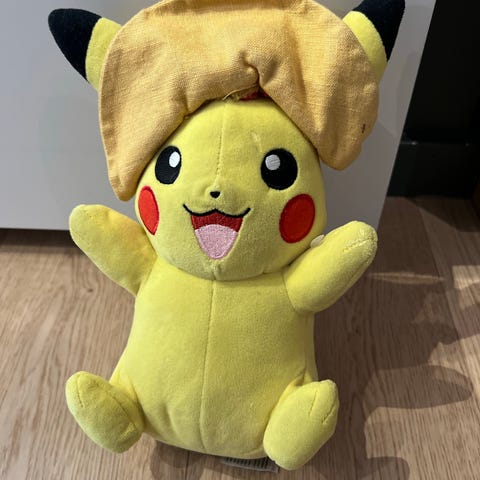 Ca 25 cm høy (med hatt) myk kosedyr Pikachu i pen stand.