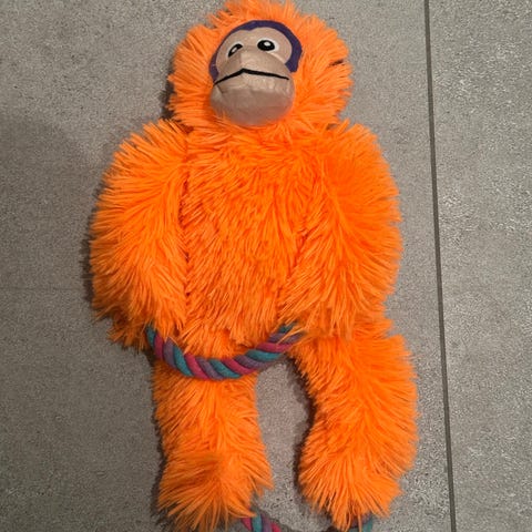 Rosa bungee lang draleke fra tug-e-nuff med strikk og håndtak som er satt på en rosa gummiball. Gummiballen er fylt med minkpels. Pelsen er løs og kan fjernes. Nylonen har fått noen «sår» som er reparert med lighter for å forhindre ytterligere revning. Ingen steder er revet/bitt helt av. Lengden er 118 cm.