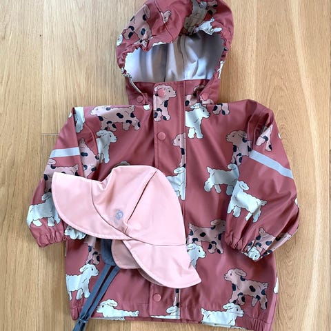 Bruse regnsett og sydvest selges. Er i fargene hvit og gammelrosa. Størrelse 92. Sydvesten er størrelse 48/50. Ingen anmerkninger såvidt jeg finner.