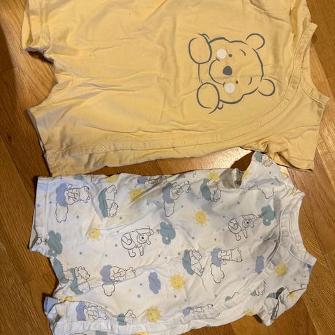Primark Disney barneklær i størrelse 80, flerfarget, designet for unisex barn. Inkluderer to plagg med ulike trykk: ett med Disney-figurer og ett med et blått og hvitt mønster. Laget av mykt materiale egnet for barn i alderen 9-12 måneder.