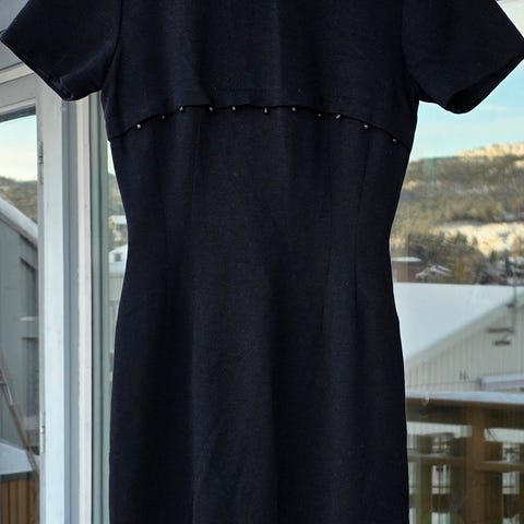 Ekte vintage kjole. Merke Gasell Modell. Tykt brokadelignende stoff. Innsydde spiler. Formsydd og innsvinget. Metall glidelås bak (metall ble brukt på den tiden). Trolig polyester. Glidelås bak. Størrelse ca S, se mål under. Skjørtet er sydd i folder. Meget pen og helt unik. Bør nok renses da det er en kaffeflekk foran, se bilde. Tilhørende jakke. Lengde fra overkant skulder til skjørtekant ca 112 cm. Omkrets under armene ca 83 cm, liv ca 65 cm. Billigste porto. Se også mine øvrige annonser (trykk på min profil for å se annonsene).