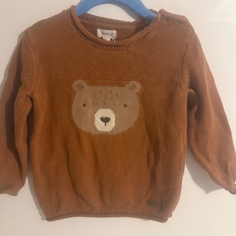 Newbie hvit stripet genser i størrelse 92 for barn. Genseren er unisex og laget for barn i denne størrelsen. Den har knappelukking foran og en liten brystlomme i blått stoff.
