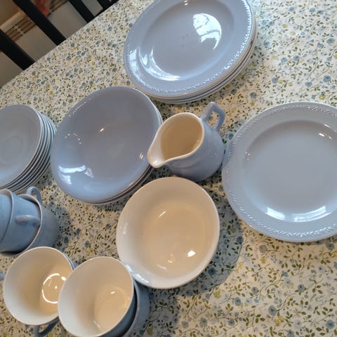 Servicedeler i blå Grete frå Figgjo flint. Det som er krakelert er kun på glasur på utsida. Innside er ok.