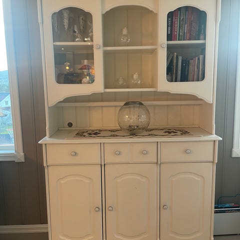 Skapet er todelt. Et tungt og solid møbel. Alder er usikkert, kanskje 40 / 50 - tallet. Fasettslipt glass dørbladene oppe. Er overmalt i nyere tid.