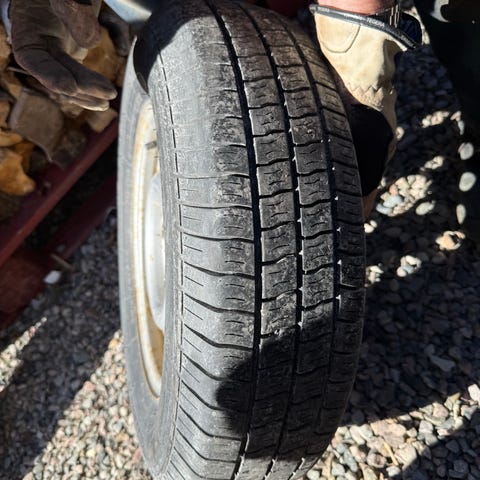 Selger 1 stk felg med dekk til tilhenger. Reservehjul. Følger med feste til felg,se bilde.