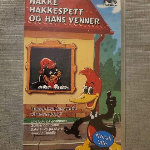 Hakke Hakkespett 4 VHS barnefilm i farger. Inneholder animert innhold med karakterene Hakke Hakkespett. VHS-kassett i originaltui av plast. Passer for barn og samlere av eldre videomedier.
