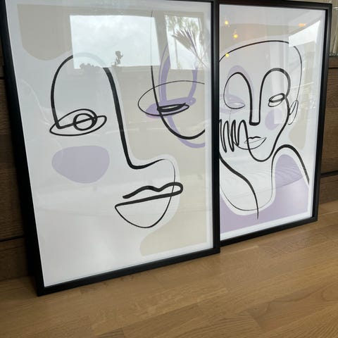 Kunstplakater i ramme, sett med 2. Plakatene viser abstrakte menneskefigurer i lilla og svart farger. Hver plakat er innrammet i svart ramme med glass. Passer til veggdekorasjon i hjem eller kontor. Av kunstner Alfred Gockel- Blue Note 2. Størrelse pr bilde m ramme 76x35