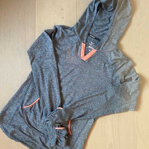 Nike Fitness hettegenser for dame i størrelse S. Genseren er mørkegrå med hvite detaljer, inkludert snorer og logo. Laget for treningsbruk, med glidelås foran og hette for ekstra dekning.