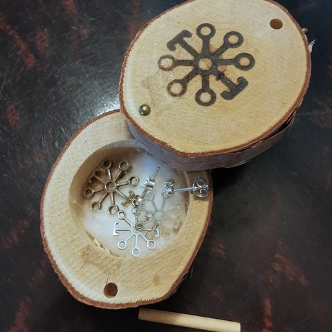 Fant denne når ryddet blant gammelt. Plata på lokket er nok Tinn. Ringen har bilde av ugle- er ca 17 mm. Har stempel og tror det står 925