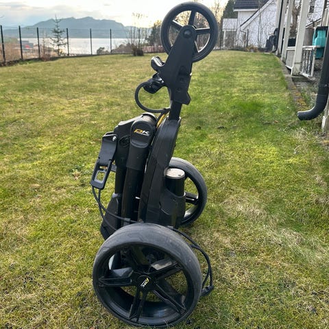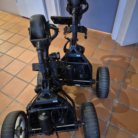 Powakaddy el-golftralle med hvit og gul farge. Trallen har tre hjul. Sammenleggbar ramme for enkel transport og oppbevaring. Utstyrt med batteri for elektrisk drift. Trallen er en eldre modell, men har så godt som ikke vært brukt pga sykdom. Trallen er meget enkel å bruke.. Batteri og lader medfølger