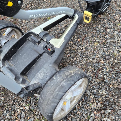 Powakaddy el-golftralle med hvit og gul farge. Trallen har tre hjul. Sammenleggbar ramme for enkel transport og oppbevaring. Utstyrt med batteri for elektrisk drift. Trallen er en eldre modell, men har så godt som ikke vært brukt pga sykdom. Trallen er meget enkel å bruke.. Batteri og lader medfølger
