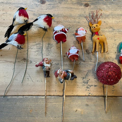 Lott med julepynt , nisser , lysestake , gris.