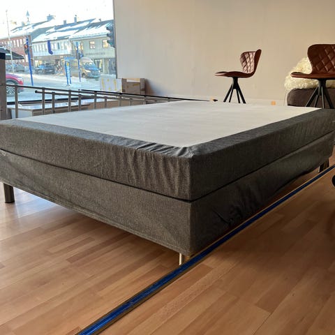 Dobbeltseng 150x200 med rammemadrass, fra Skeidar. Er veldig lite brukt, kjøpt ny i 2024. Har stått på gjesterom. Selges pga lite plass.
