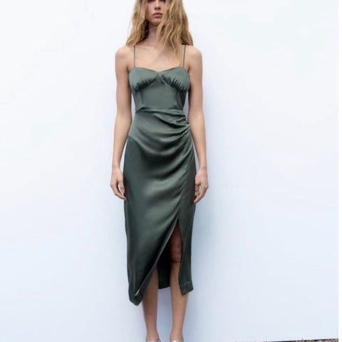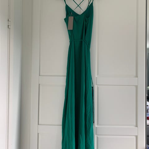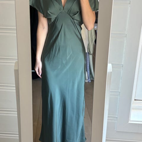 Zara Festkjole i størrelse S, grønn farge. Kjolen har tynne stropper. Laget av lett materiale, egnet for formelle anledninger.