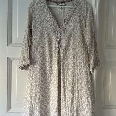 Nydelig kjole i 100 % lin. Hvit men med vakre gyldne broderier på ermer og utringning.