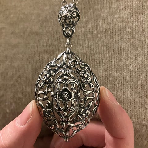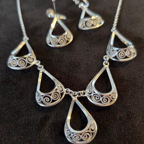 Anheng i sølv fra den norske sølvsmia. Arvet fra mormor som elsket dette smykke. Kan minne om arbeid som på søljer. Det er 40cm langt.