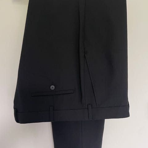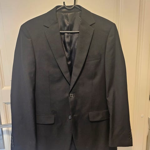 Selger også en dressjakke i str. 56 Regular, også fra Dressmann. Den har brystlomme, to lommer i front og tre innerlommer. Glatt for på innsiden og splitter i sidene.