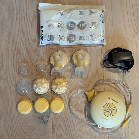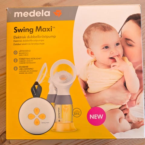 Medela Swing Maxi elektrisk brystpumpe i gul farge. Inneholder pumpeenhet, brystskjold, flasker, slanger og tilbehør. Designet for effektiv pumping med dobbel pumpefunksjon. Egnet for mødre som ønsker å pumpe melk til babyer. Inneholder også Medela Swing pumpe, Medela HARMONY (mangler en flaske på den) og Medela breastcollector i tillegg til ekstra utstyr som lader, slanger, valver og membraner.
