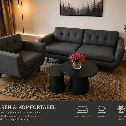 Selger en loungestol i skandinavisk, stilren design med buet ryggstø. Trekk med skumfyll. Ben av svartemetall.