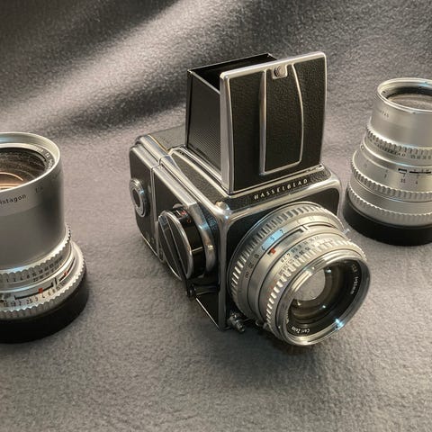Jeg selger en pent brukt Hasselblad 500 C/M med en Hasselblad Planar 80 mm/2,8 T* linse m/ solblender og 2 stk A12 magasin.