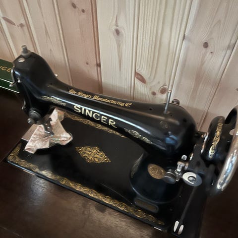 Singer Symaskin med elektrisk motor, svart farge. Maskinen er en eldre modell med metallkonstruksjon. Leveres med strømledning og fotpedal.