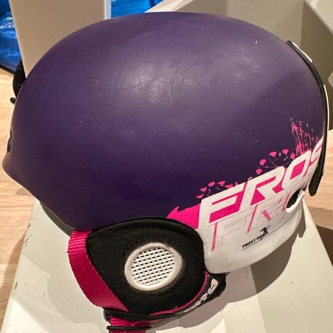 Frost skihjelm i blå farge med justerbar størrelse. Hjelmen har en solid konstruksjon med justeringsmekanisme for en sikker og komfortabel passform. Egnet for bruk ved sykling for å beskytte hodet.