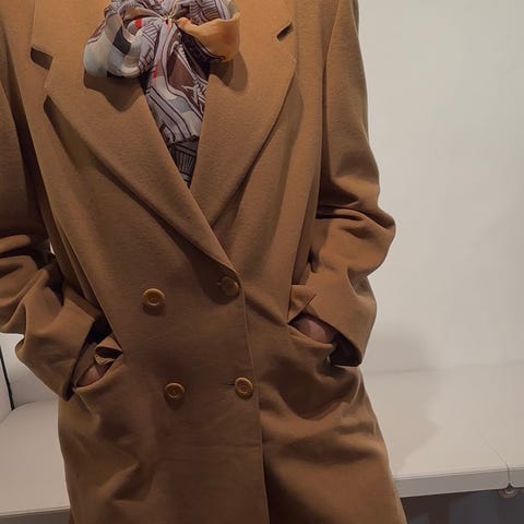 Antrekk bestående av, jakke i ullblanding fra Lindex - ny, bluse fra Lucky Brand, sorte bukser fra George og et skjerf følger med