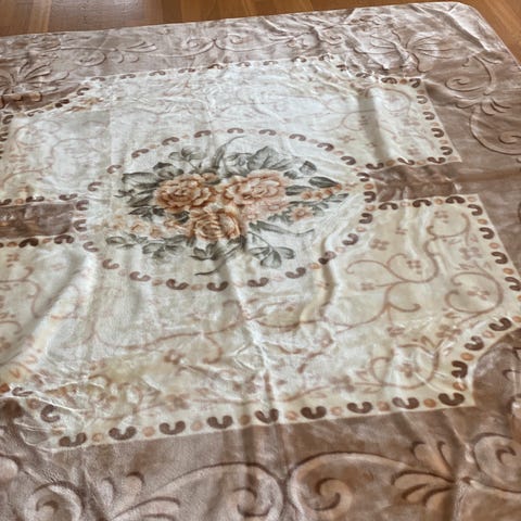 Det er et skikkelig tykt og veldig pent teppe uten skader. Teppet fremstår som ubrukt.
