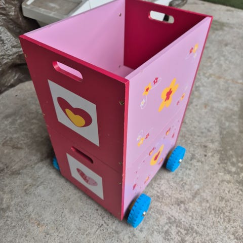 Skuffen er av tre, og har hjul.