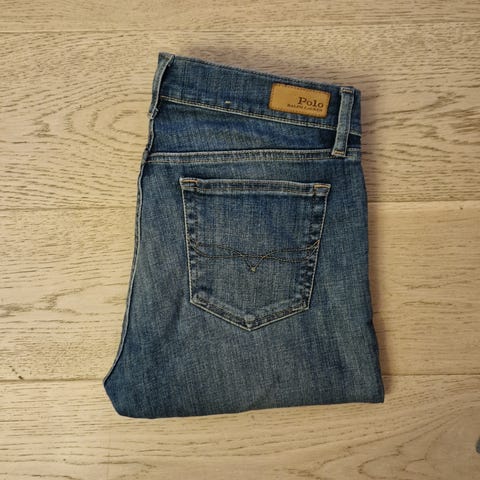 Ralph Lauren jeans i blå farge, størrelse W30 L34 M. Laget av 100 % bomull. Klassisk design med knappestolpe og fem lommer. Passer for menn.