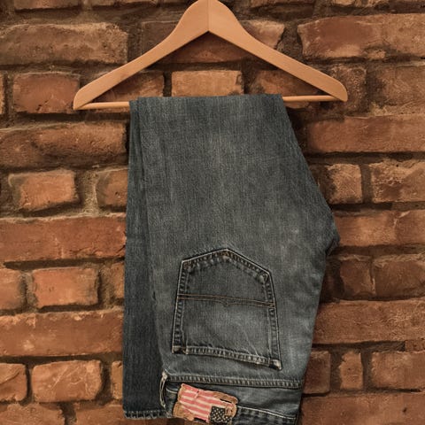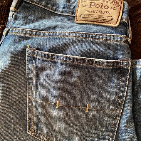 Ralph Lauren jeans i blå farge, størrelse W30 L34 M. Laget av 100 % bomull. Klassisk design med knappestolpe og fem lommer. Passer for menn.