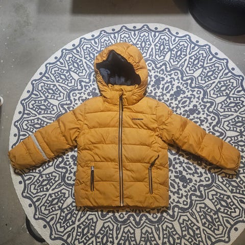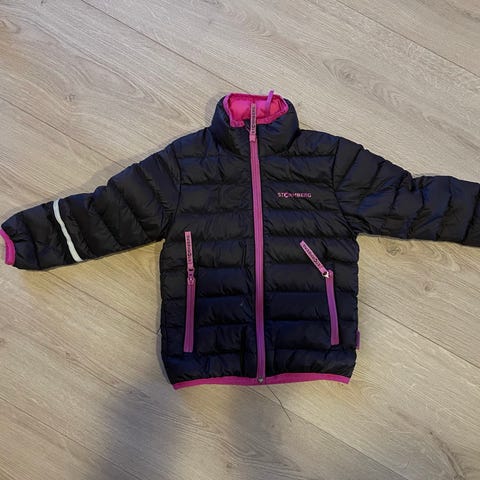 Dunjakke fra Stormberg, str 4 år. Pent brukt, men et bittelite hull, noen småsår og noen løse tråder(se bilder). Ingen av disse har noe å si for bruken. Hullet kan lappes om ønskelig, men har ikke fargen brun i lappesakene.
