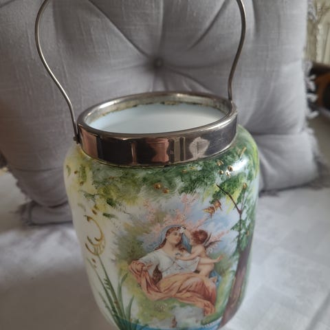 Antikk spansk glasskrukke dekket av preget lær med motiver av Don Quijote de la Mancha