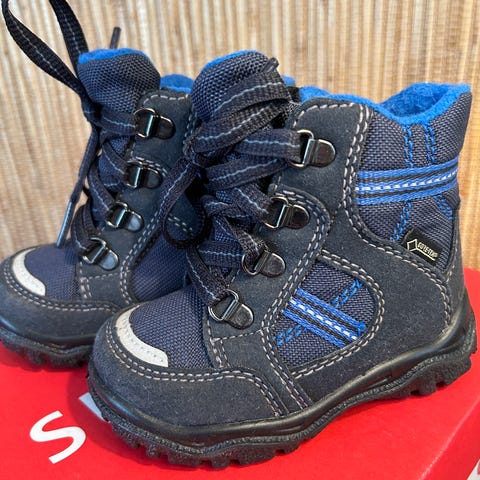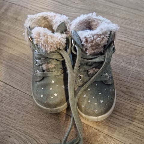 Superfit barnesko for jente i størrelse 20. Skoene er lys lilla med stjernemønster og har pelsfôr på innsiden for ekstra varme. Laget med snøring foran for justerbar passform. Det er en veldig fin sko, men datteren min brukte den bare i én uke fordi foten hennes vokste for fort. Det er som ny.