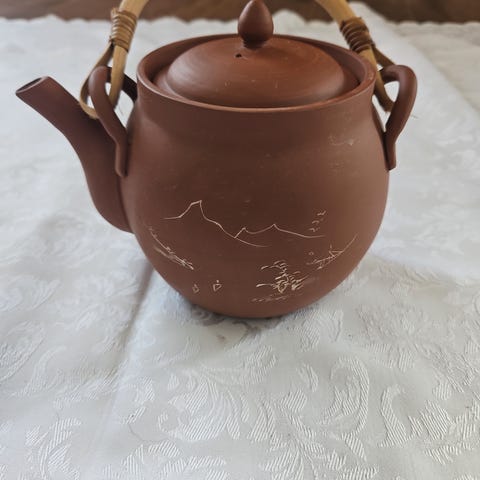 Fin tekanne i terracotta. Ca 19 cm høy med hanken. Har sil så fin å bruke til liten blomsterpotte. Et lite nagg I lokk, som vist på bildet. Selges kr 175 pluss event frakt