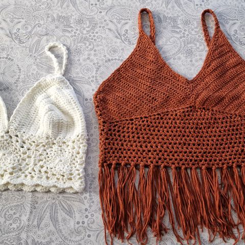 En rød og en hvit blonde cropped top fra Bikbok selges i Str. S.